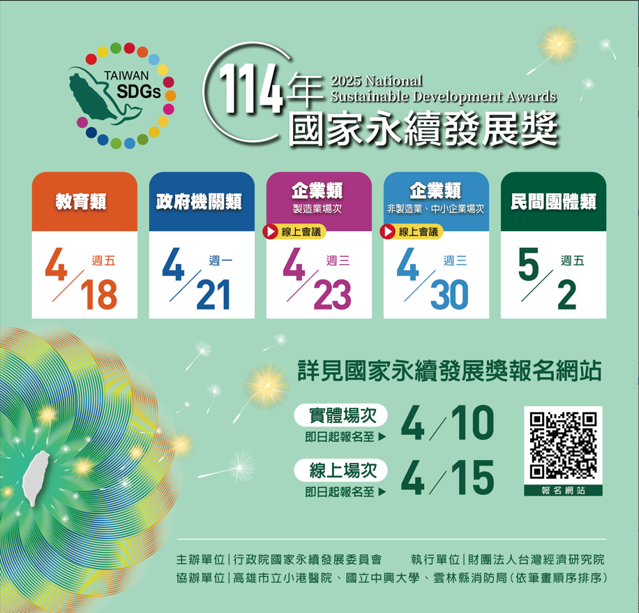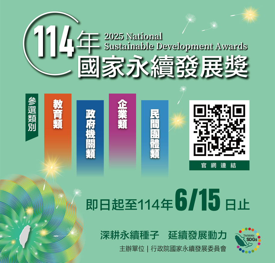 三、為增進各界對於國家永續發展獎之瞭解,並促進永續發展 相關經驗互相交流與分享,行政院國家永續發展委員會另 舉辦「114年國家永續發展獎說明及觀摩會議」,可免費線上報名,歡迎有意參加選拔者踴躍參加,教育類場次資訊 如下: