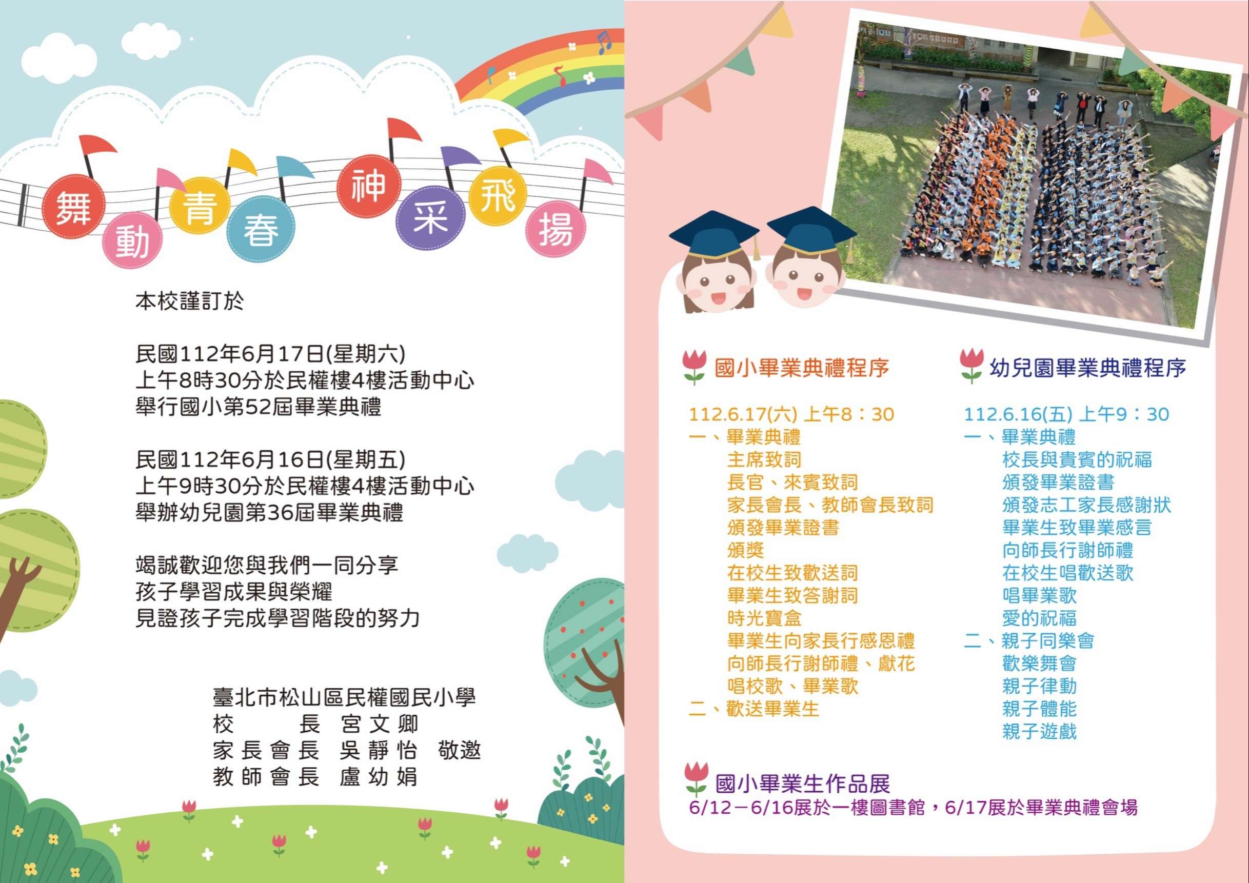 本校國小部謹訂於112年6月17日(星期六)上午八點三十分於民權樓四樓活動中心舉行第五十二屆畢業典禮,歡迎家長們踴躍到校觀禮,家長觀禮位置安排於活動中心五樓。當日活動因參加的人數眾多,仍建議家長配戴口罩,以維彼此健康。活動時間與內容詳如附件邀請卡,誠摯邀請家長們一同到場為畢業生獻上祝福。