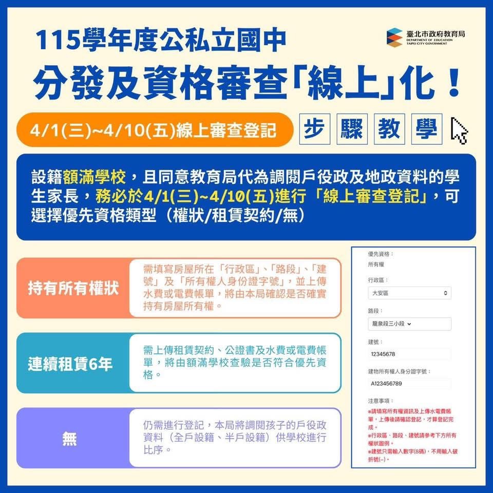 提醒:請符合「額滿學校學區」且「同意調閱戶役政及地政 資料」之家長,於115年4月1日至4月10日間至「新生分發入學作業平臺」進行「額滿學校優先資格線上登記」。